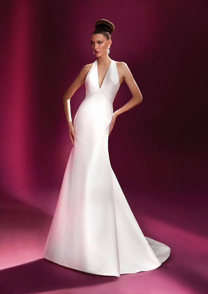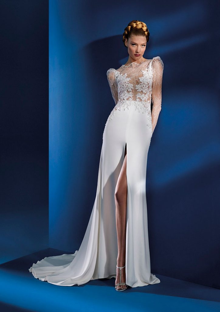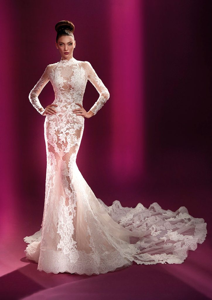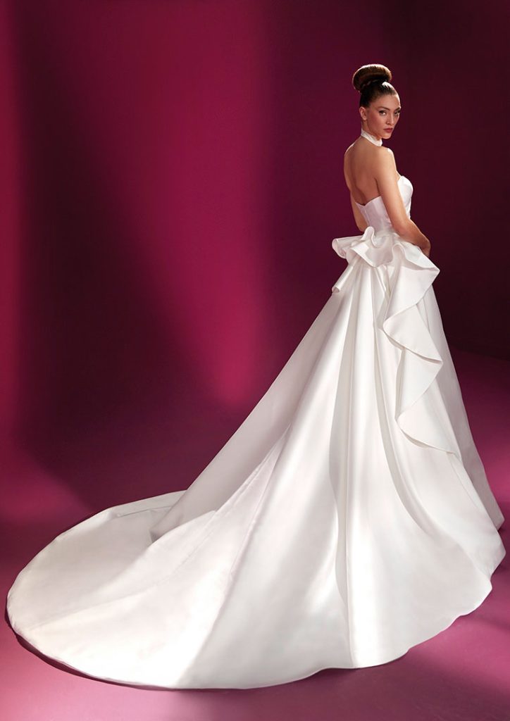 Las nuevas siluetas en forma de campana y de columna soportan colas de gran longitud y cascadas de volantes, mientras que los escotes altos, los hombros con volumen y las mangas abullonadas aportan el tipo de dramatismo y formalidad real que muchas novias desean.
