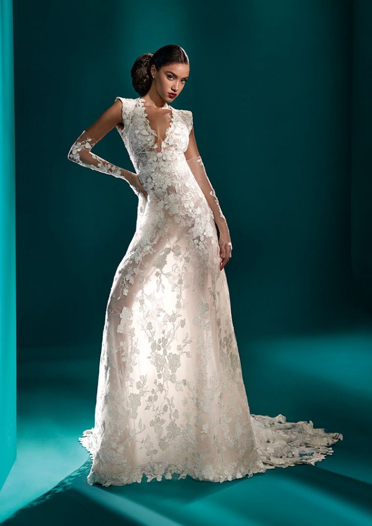 La Colección Versailles presenta aún más posibilidades de personalización para la novia. Desde una variedad de cuellos y espaldas, estilos y longitudes de mangas, y opciones de tejido, cola y falda.