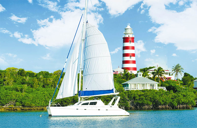 Abaco es un paraíso para los navegantes. Así que un velero y el Faro Candy-Striped en Hope Town, conforman la postal perfecta.